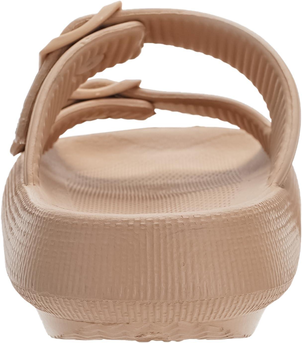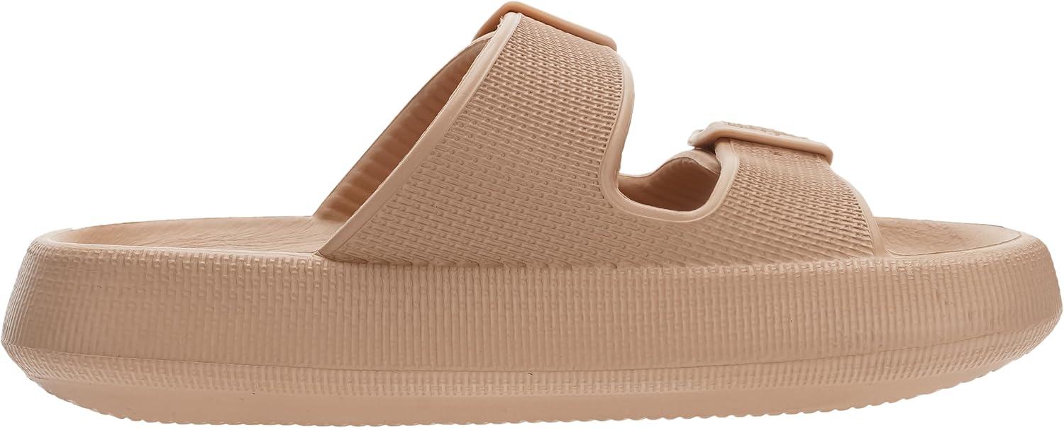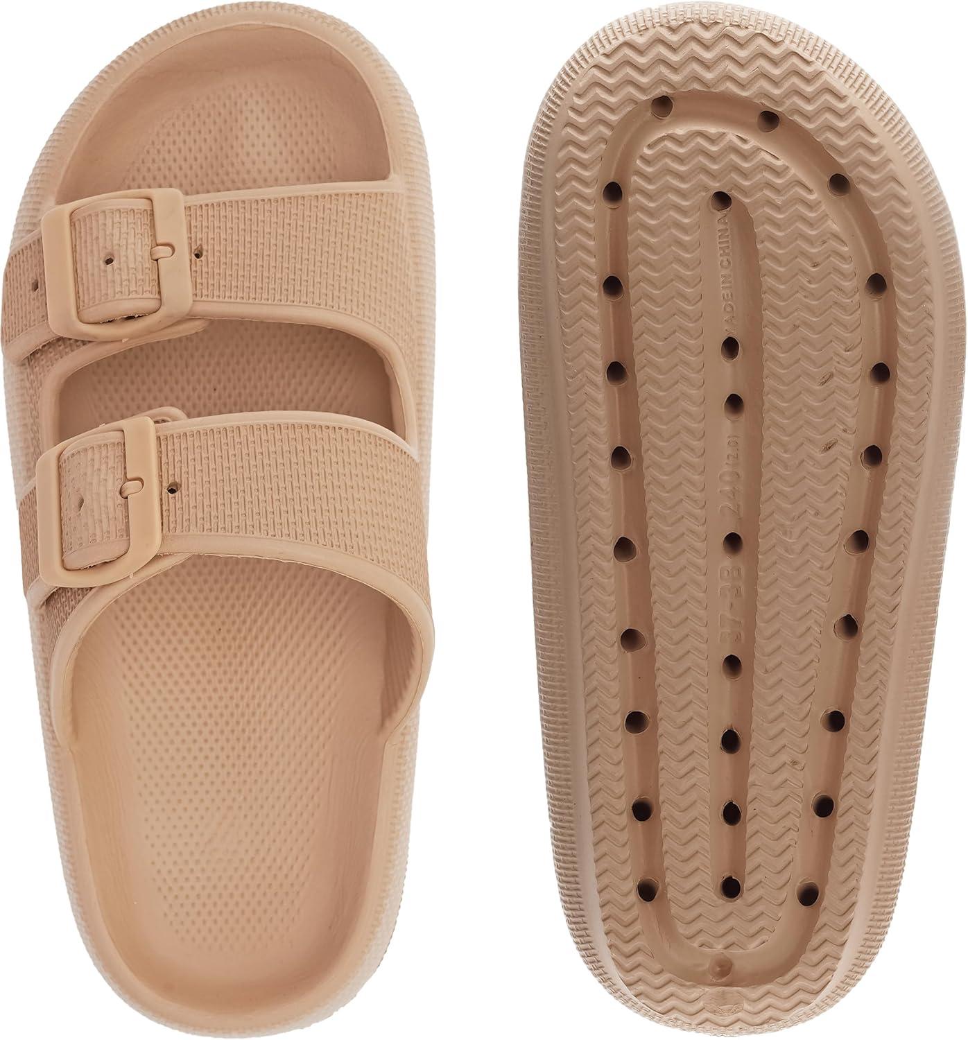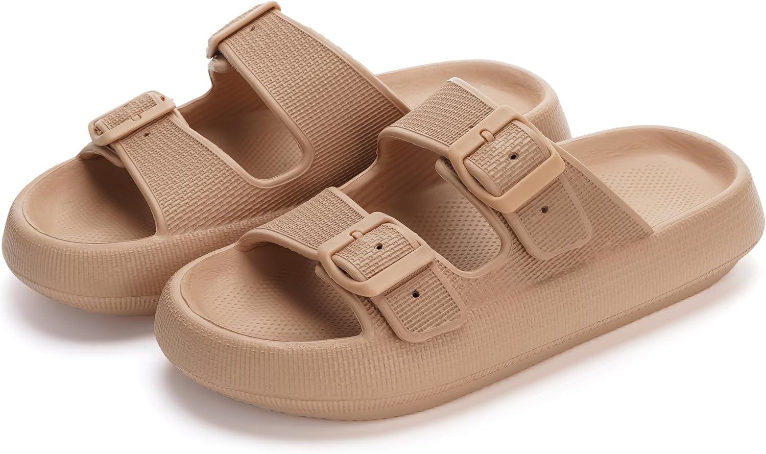 WHITIN Slides for Women Men Double Buckle Adjustable Thick Sole Pillow Slippers Bathroom Sandals(Khaki)